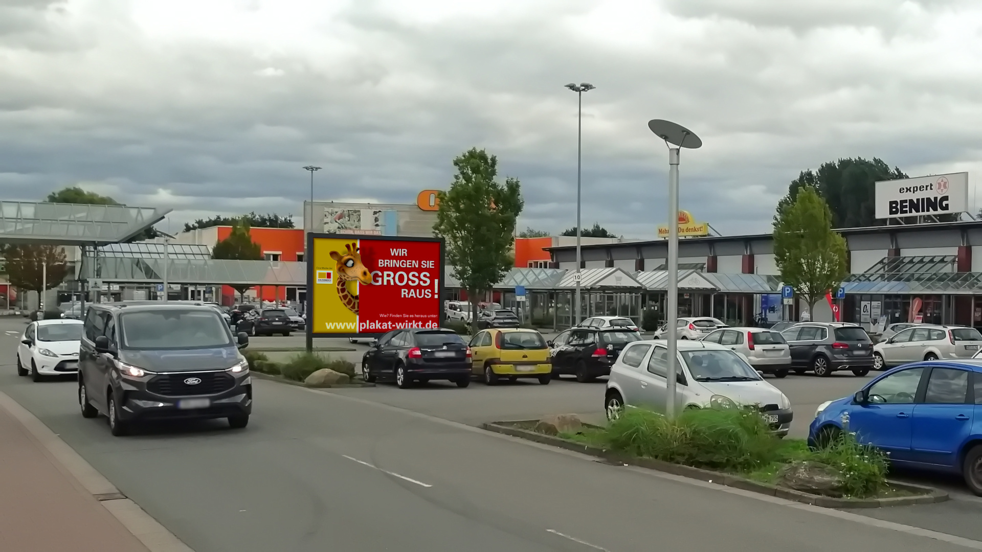 Aufmerksamkeit dort, wo Menschen täglich unterwegs sind: Unser Standort des Monats liegt an einem stark frequentierten Einkaufszentrum an der Falkentrotter Straße in Vechta. Die großflächige Plakatwerbung erreicht hier Besucherinnen und Besucher genau im richtigen Moment – beim Einkaufen, Erledigen alltäglicher Wege und im direkten Umfeld zahlreicher Angebote.